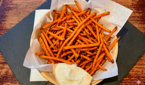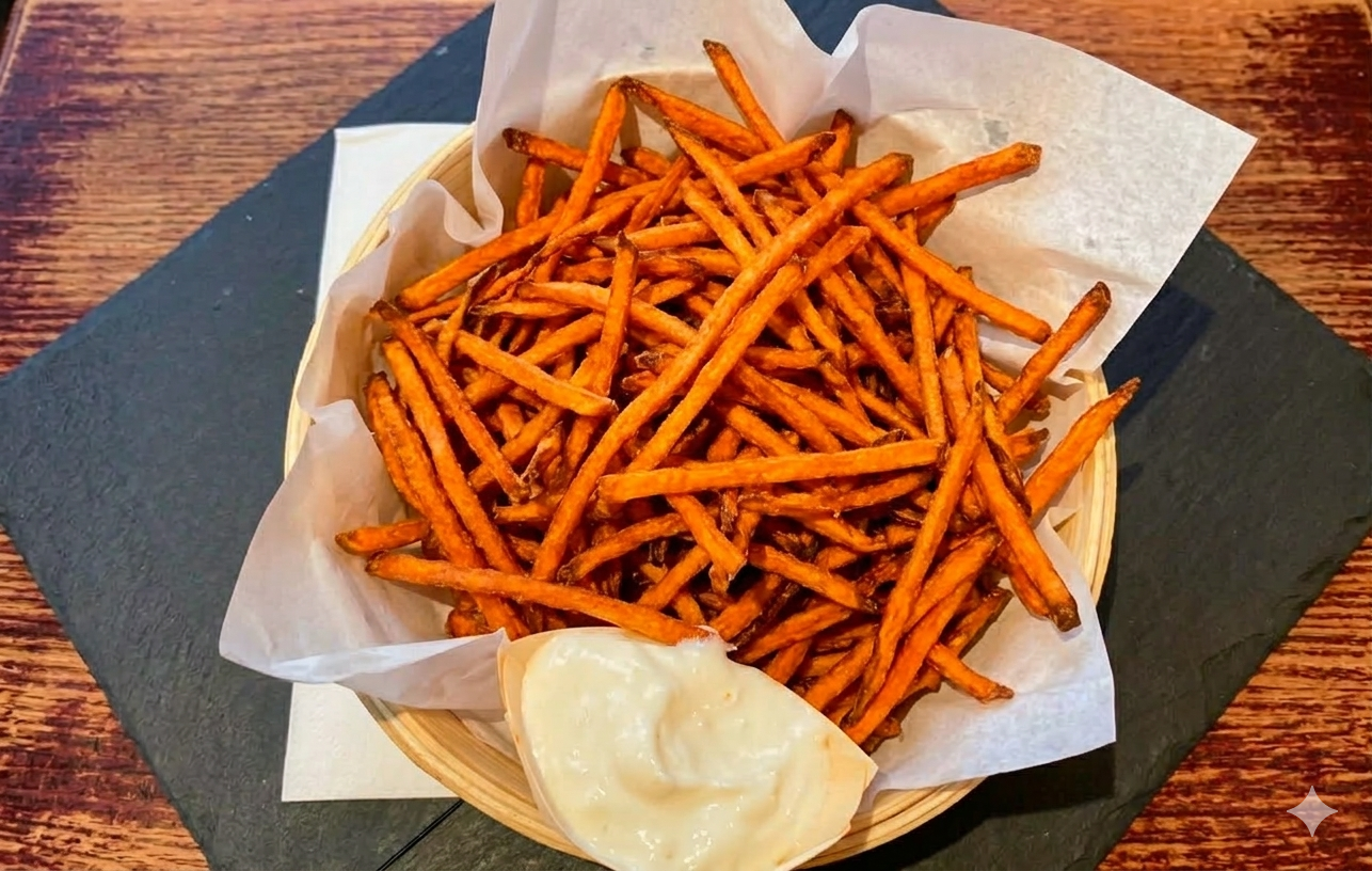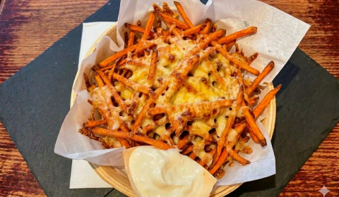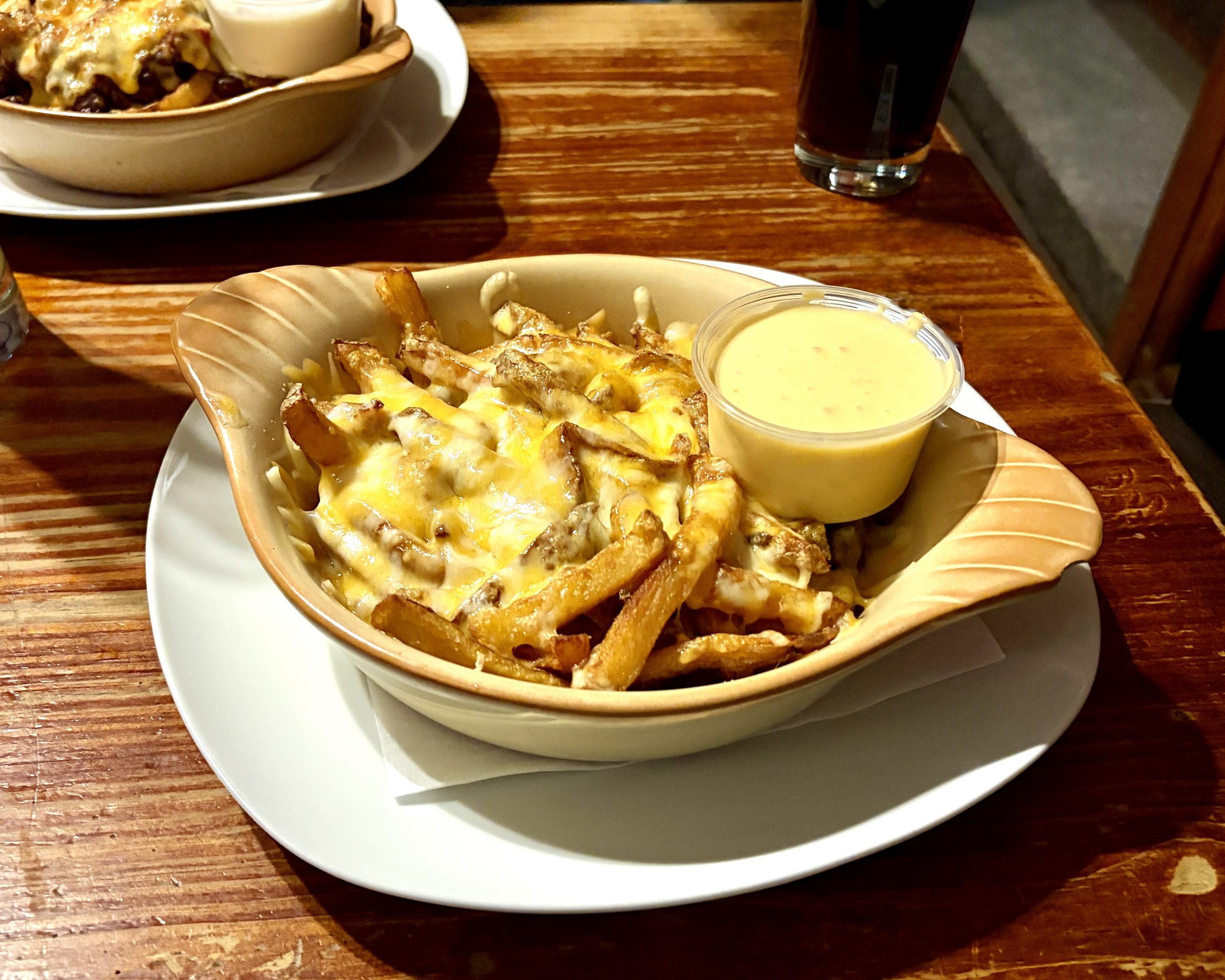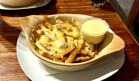 Hausgemachte Pommes mit Chili con/sin Carne und Käse überbacken, dazu saure Sahne / Homemade Chips with Chili con/sin Carne and Cheese A, G, M
