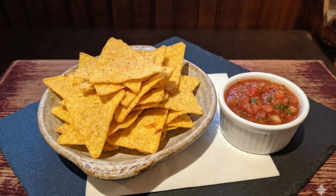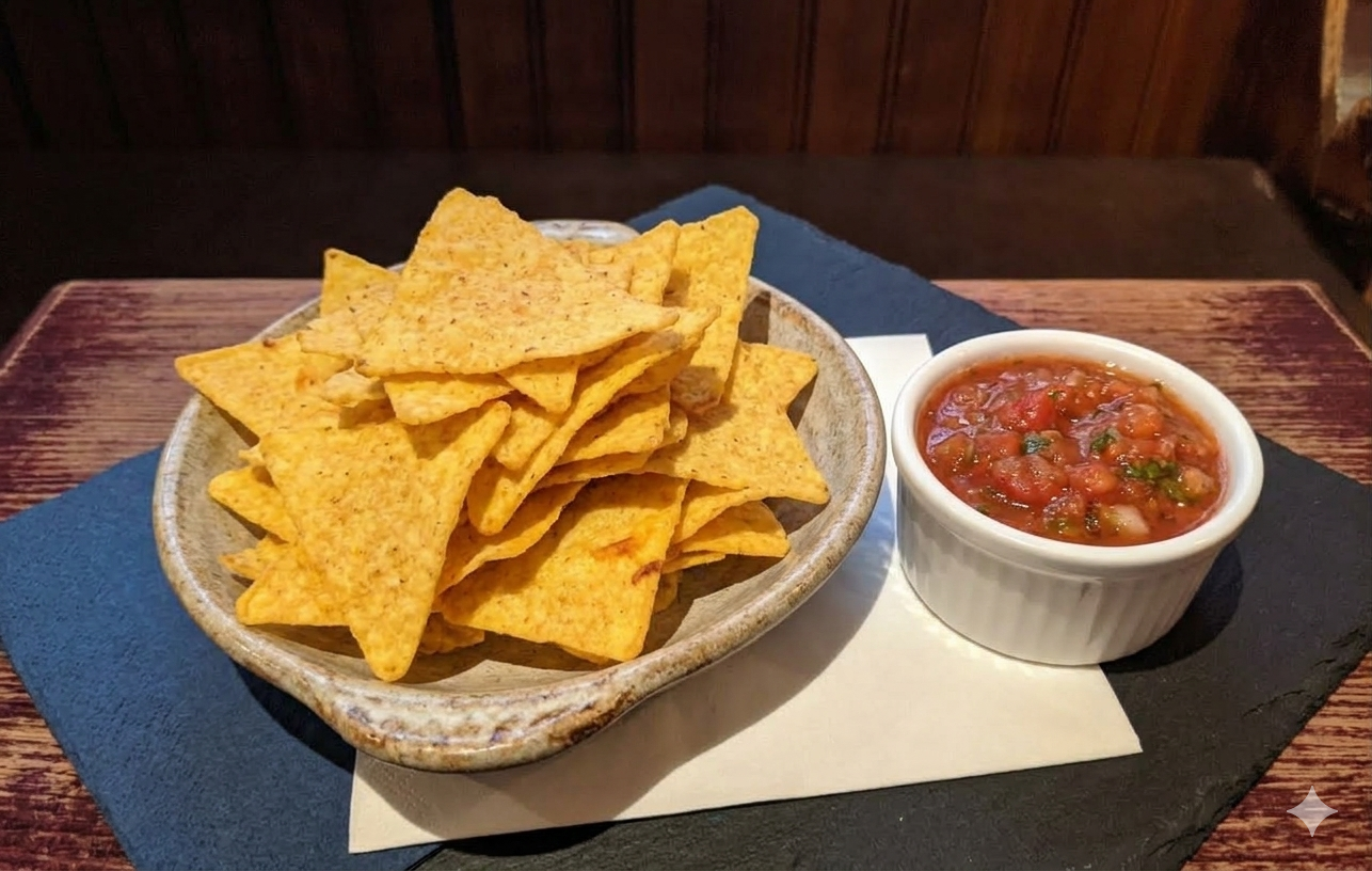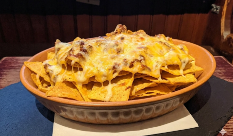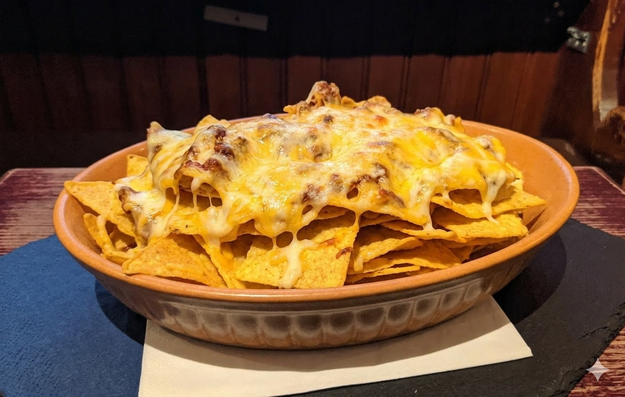 Nachos mit Chili con/sin Carne und Käse überbacken, dazu saure Sahne / Nacho Chips with Chili con/sin Carne and Cheese A, G, M